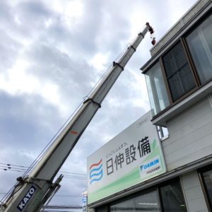 室外機を2Fバルコニーへ上げるため、朝からクレーンを使っての作業