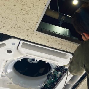 既存の室内機を取りはずし、新しい機器を取付、埋込式なので天井裏を開けています。